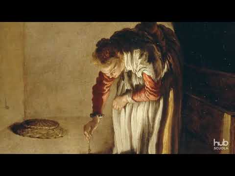 Questa rara immagine della Parabola della dracma perduta viene qui utilizzata come spunto narrativo per una raffigurazione di una scena di vita quotidiana nel XVII secolo; per questo potrebbe essere scambiata con una scena di genere, con la pulizia e il riassetto della casa da parte della massaia.